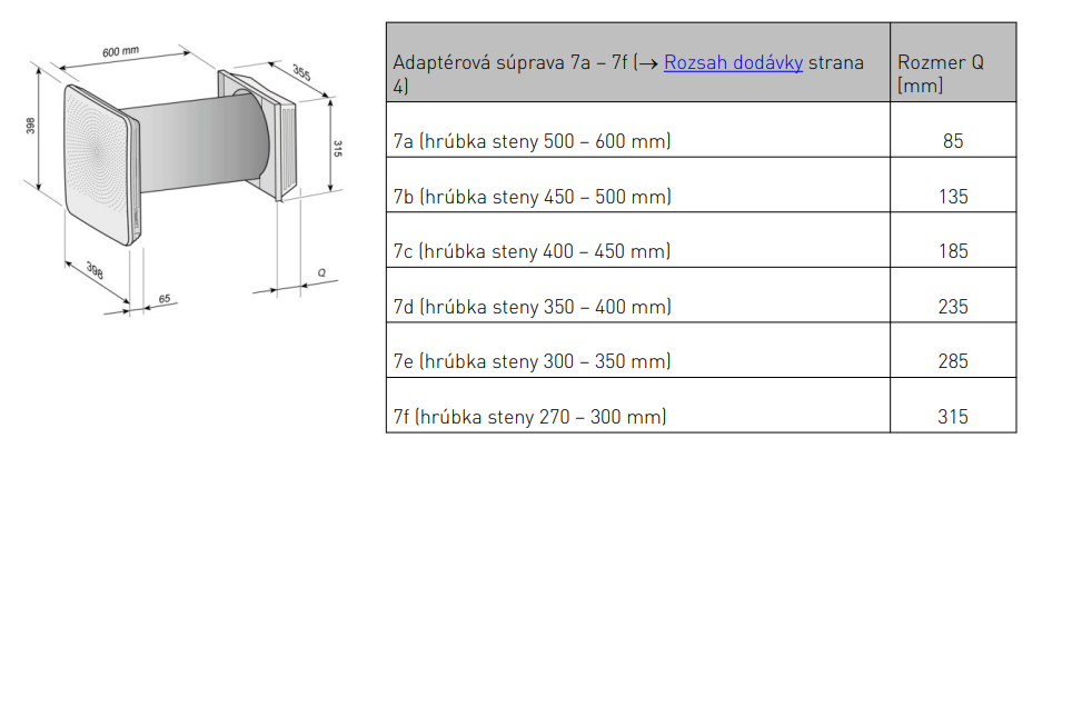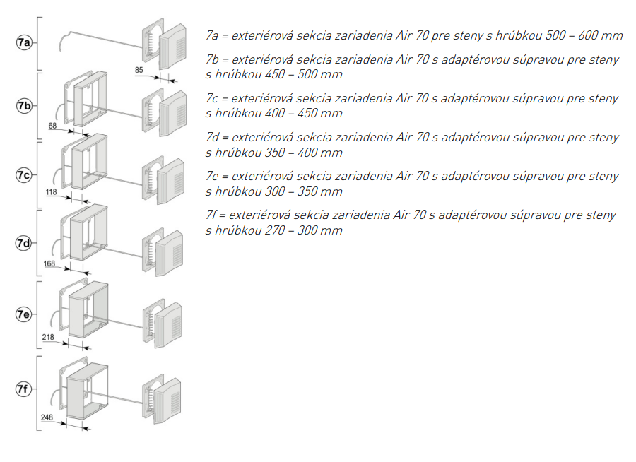 Štandardná inštalačná sada Air 70 je dimenzovaná pre steny s hrúbkou 500 – 600 mm. Ak má vaša obvodová konštrukcia (vrátane zateplenia a omietky) hrúbku v rozmedzí 450 – 500 mm, tento nadstavec prekryje rozdiel a zabezpečí pevné uchytenie mriežky.